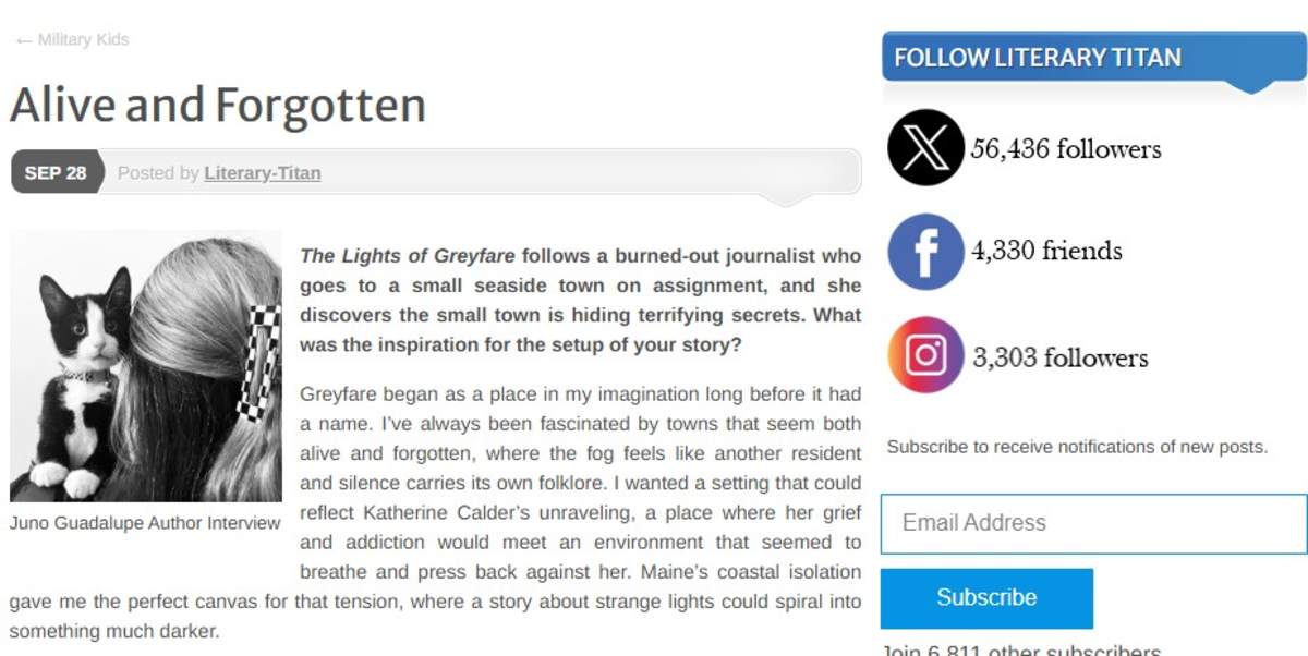 Seeing that Literary Titan chose to spotlight The Lights of Greyfare is validation that the weird, atmospheric, emotionally haunted stories I love do resonate beyond my own head. I hope this feature brings the book to new readers who’ll walk the coast of Greyfare in their imaginations, feel the fog press in, and remember that sometimes the scariest monsters are the ones that echo what we hide inside ourselves.